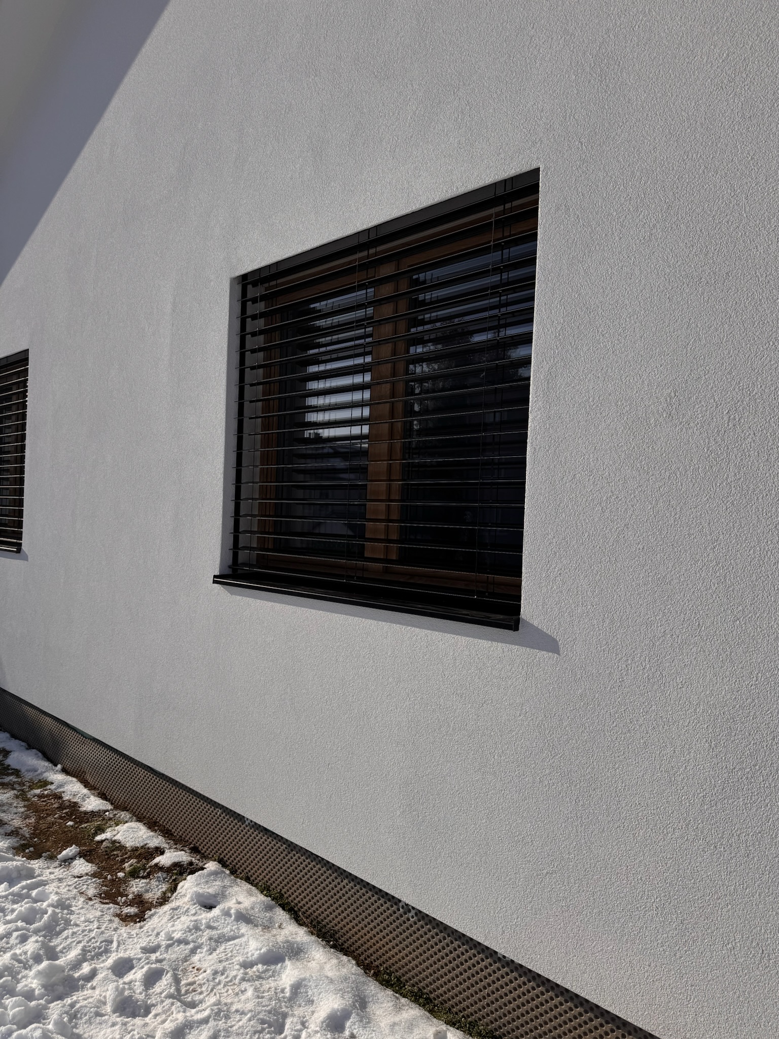 Exteriérové žalúzie Z90 v matnej antracitovej farbe v kombinácií s obkladom v imitácií drevených lamiel.