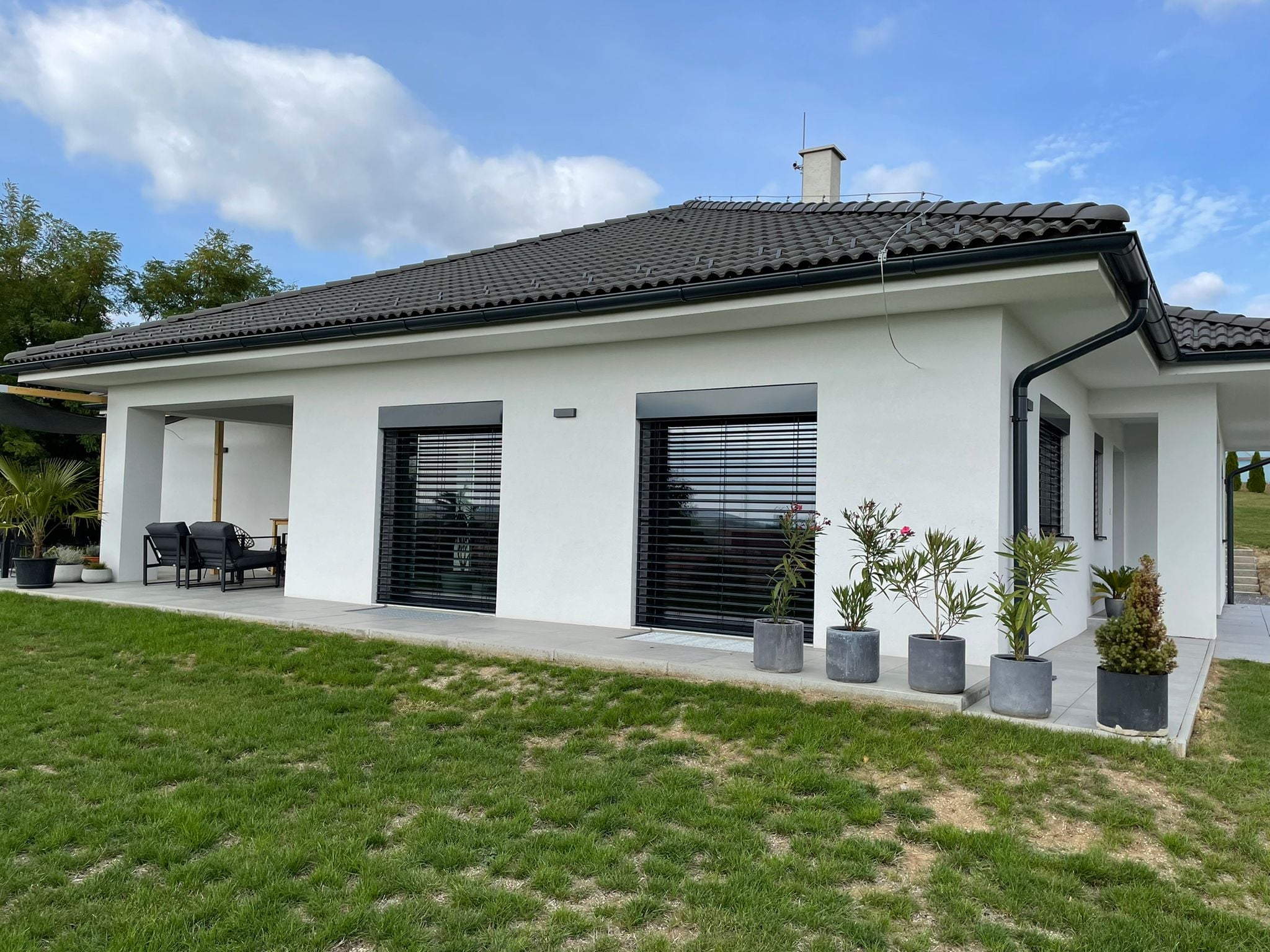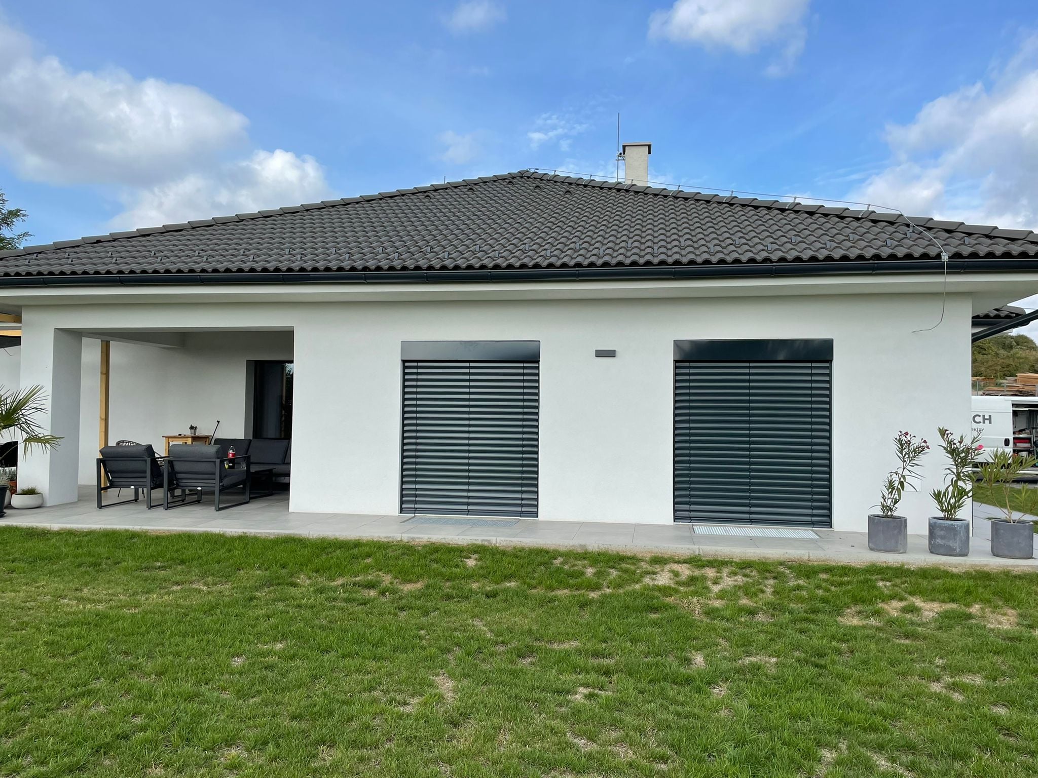 Pod krycím plechom sú namontované žalúzie Z90 v antracitovej farbe, poháňané motorom SOMFY IO na diaľkové + aplikácia TAHOMA