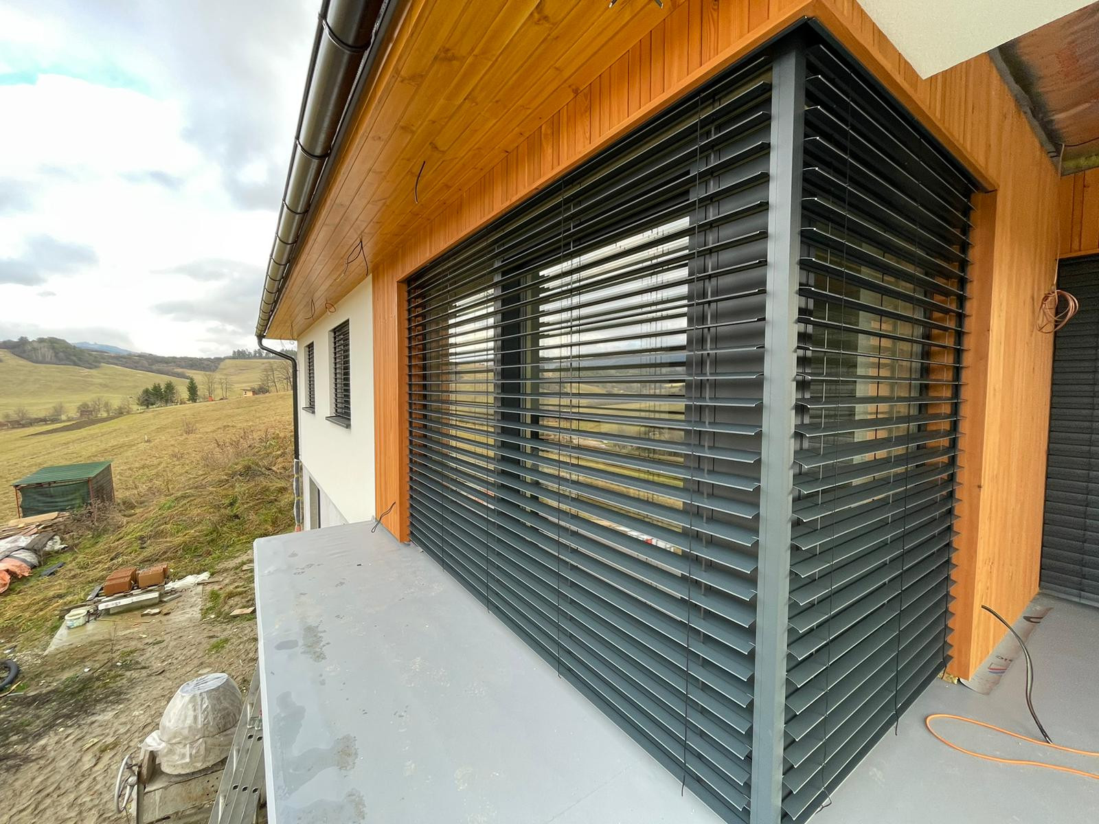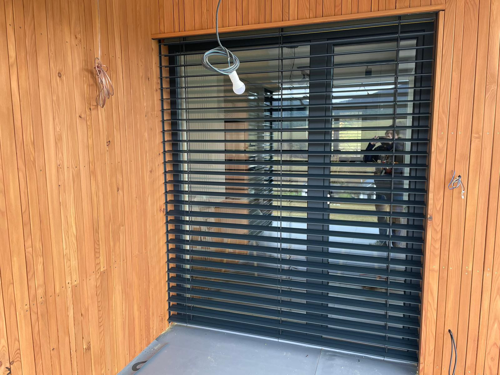 Exteriérové žalúzie Z90 v matnej antracitovej farbe v kombinácií s obkladom v imitácií drevených lamiel.