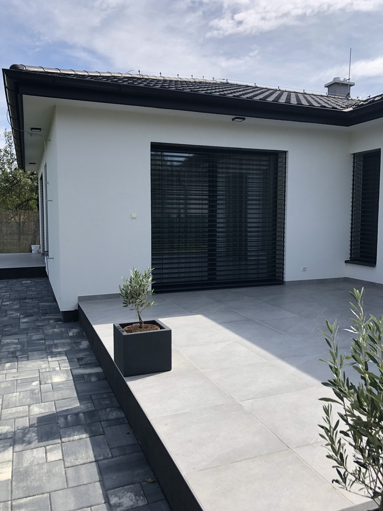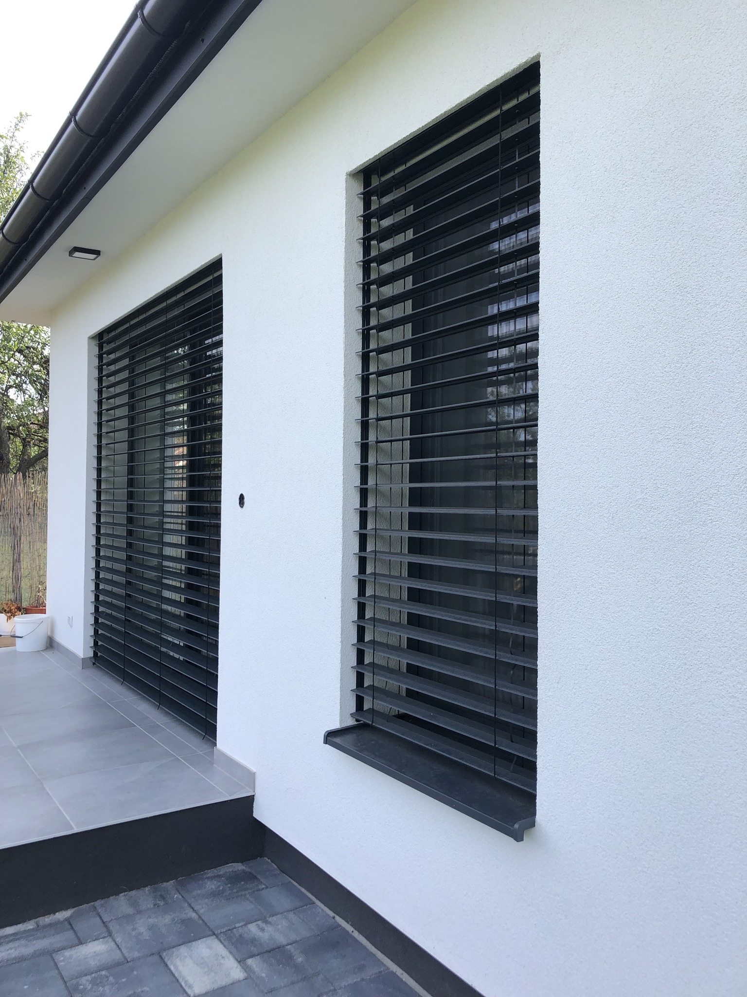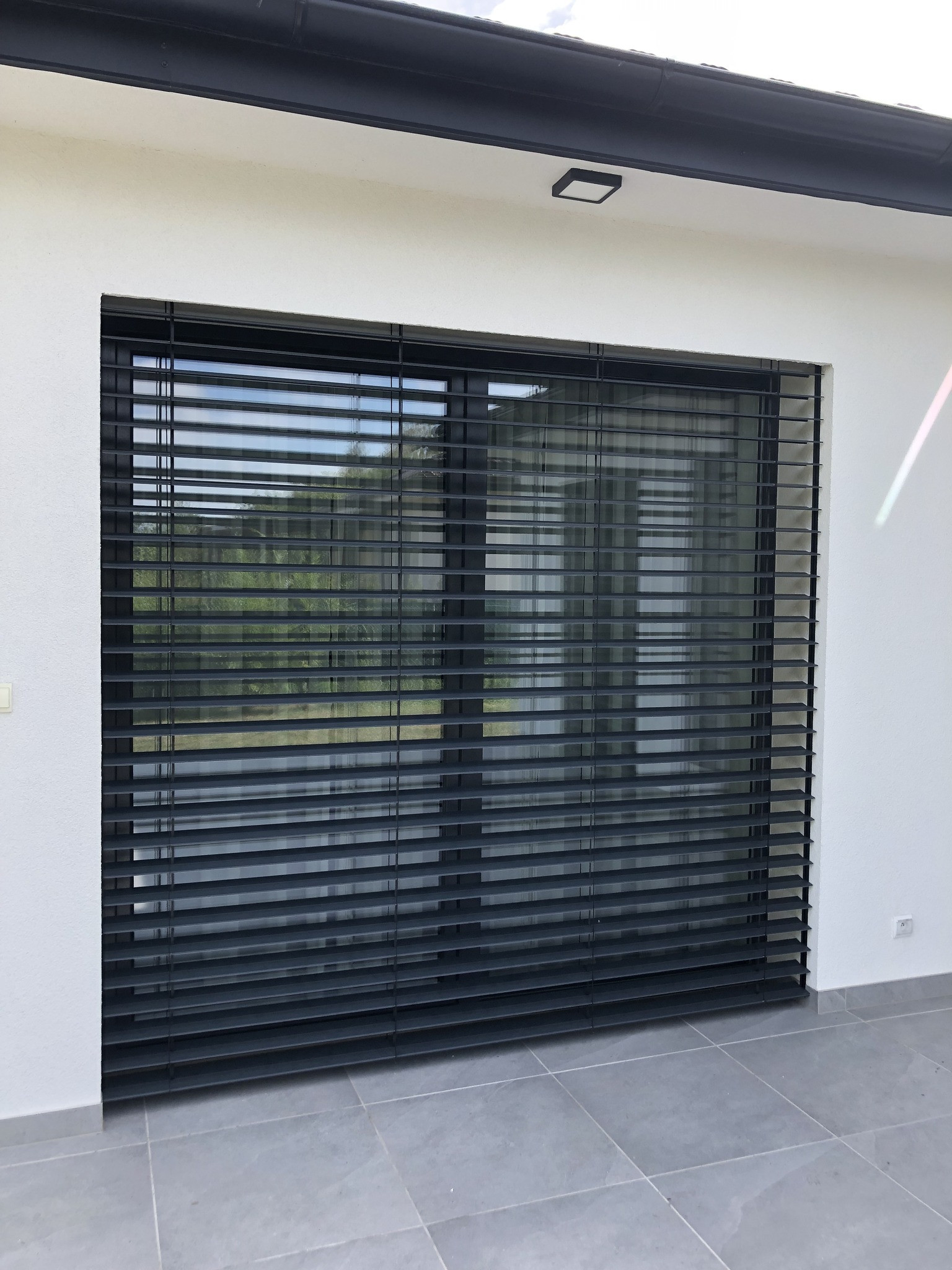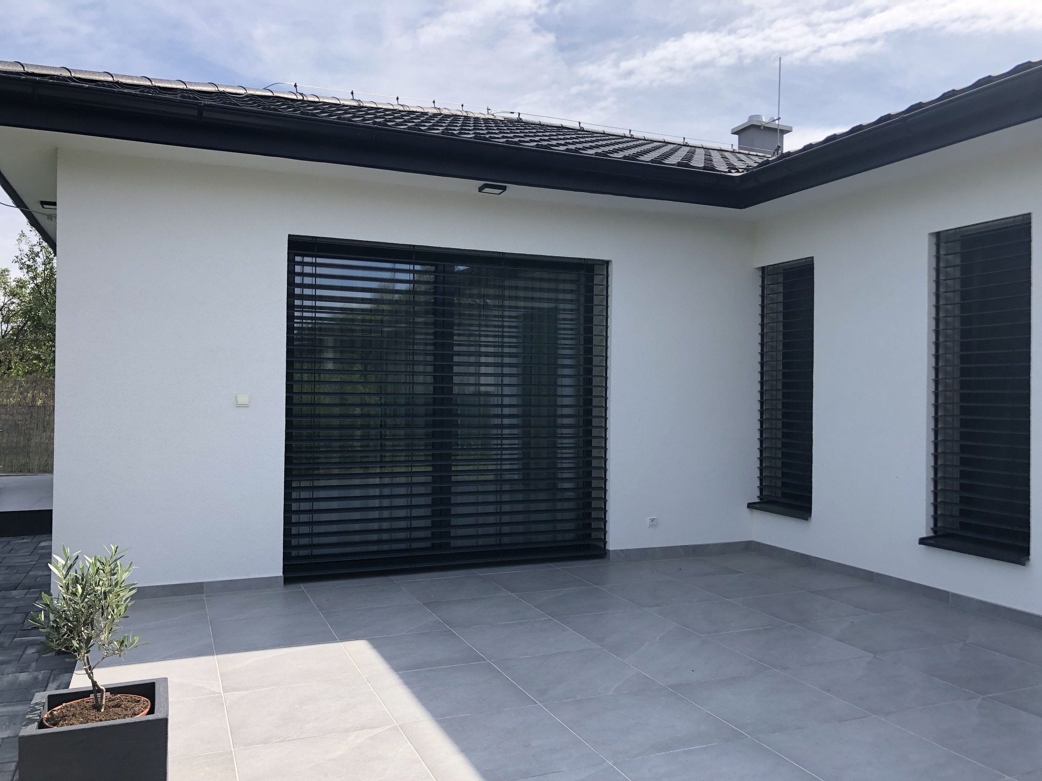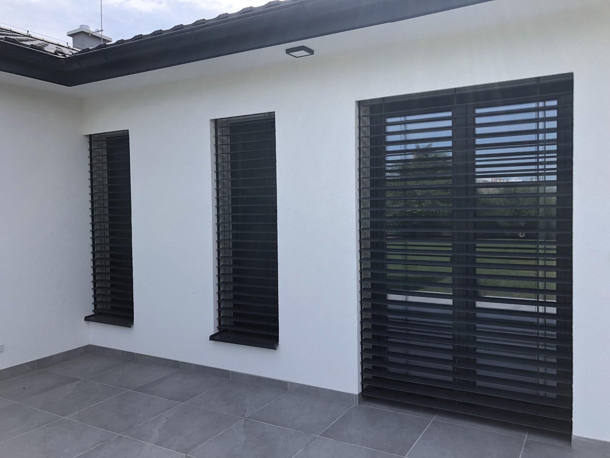 Exteriérové žalúzie Z90 v matnej antracitovej farbe v kombinácií s obkladom v imitácií drevených lamiel.