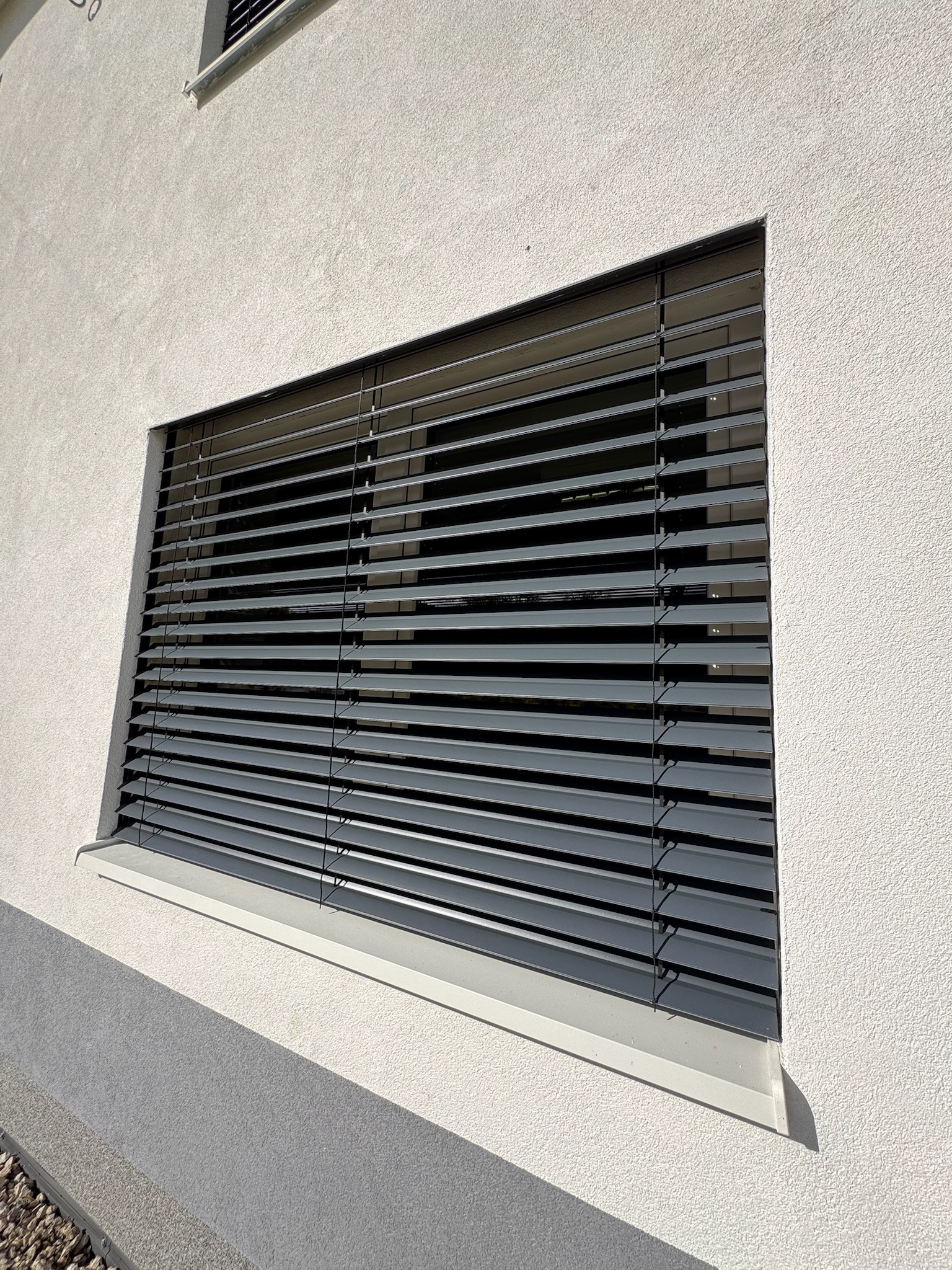 Exteriérové žalúzie Z90 v matnej antracitovej farbe v kombinácií s obkladom v imitácií drevených lamiel.